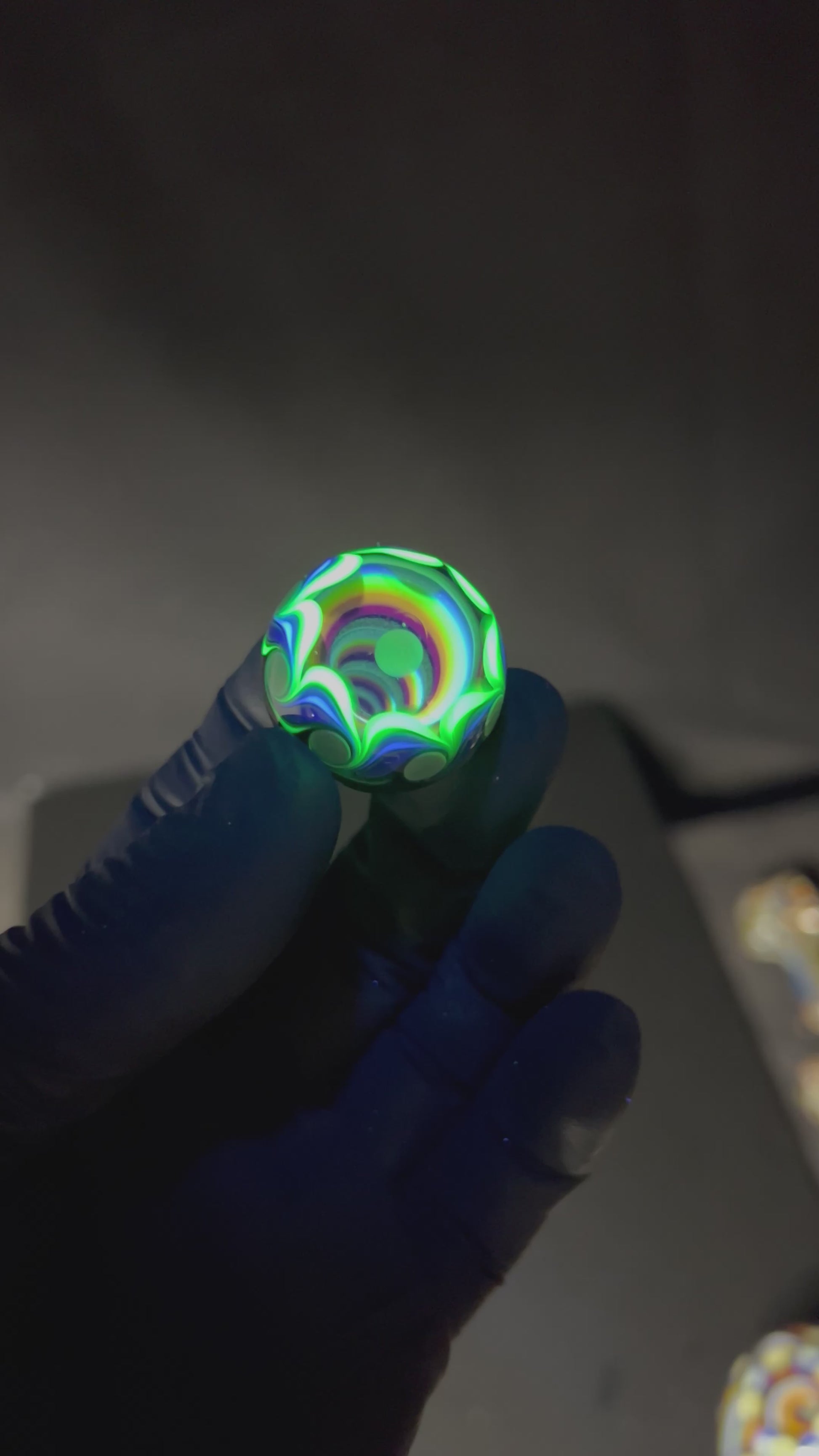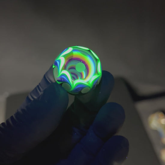 28mm UV Mini Vortex Marble made by Paulie and Vance. My son @Glanceglass has been helping with these filling in the back of the marble and picking the base colors. Signed and dated Paulie 11/24